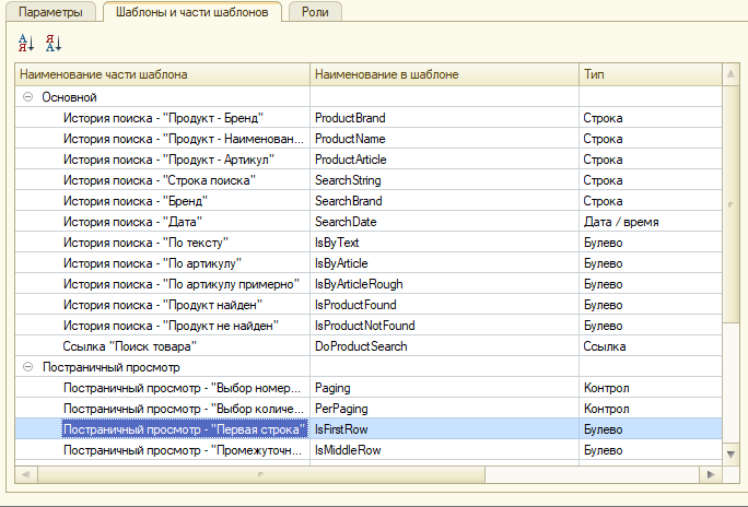 Группы формируются по какому-либо логическому признаку, как правило, для удобства верстки. Кроме того, к каждой группе частей шаблонов могут быть привязаны группы типовых частей шаблонов - части шаблонов, общие для нескольких контролов.